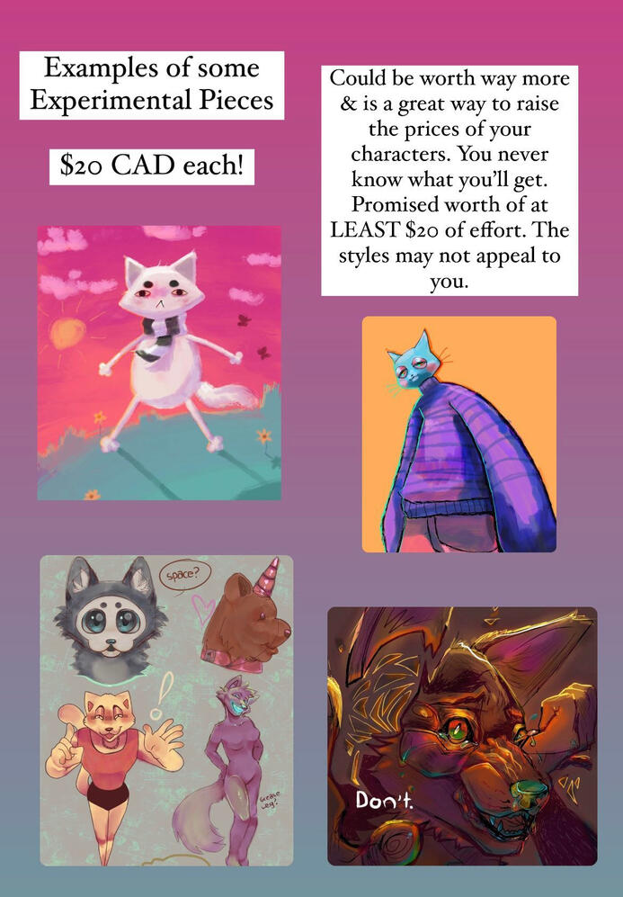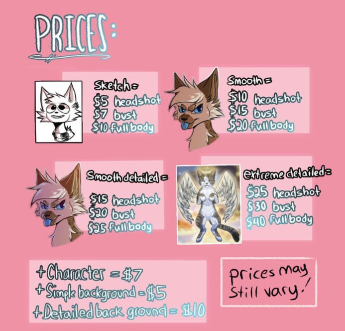 DISCLAIMER:I may ask you questions about your commission throughout the process. Progress will halt if important questions go unanswered. It is not my fault if your commission takes long or is late in response to this. I do NOT tolerate scams. I won’t give away what’ll happen if you attempt one. I heavily encourage you to look at my instagram to get a good grip of what I may produce. It is not my fault if you end up unhappy with your commission. You have all the resources available to make a solid decision on wether or not you would like something from me. It is your responsibility to not only provide me with as much detail & feedback that is necessary for your satisfaction, but also research my art and come to a solid conclusion on if you would be satisfied with a commission from me.
